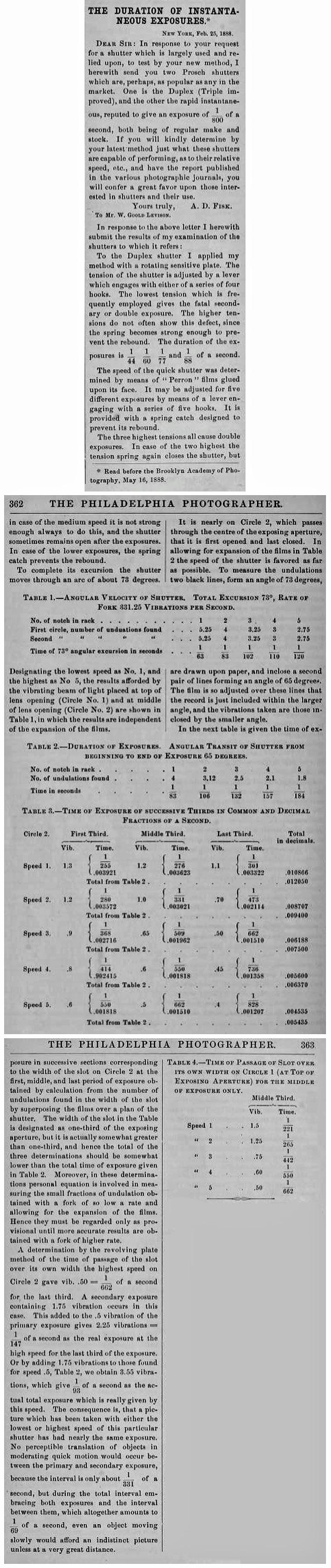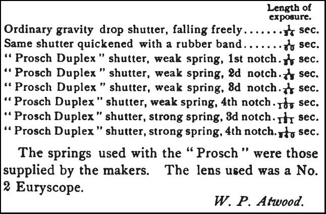 Two different tension springs were supplied with the Duplex shutters - a "weak" and a "strong" spring. These would further expand the range of speeds available to the photographer. The July 29, 1887 issue of The Photographic Times, featured an article by someone testing speeds on their Duplex shutter.
