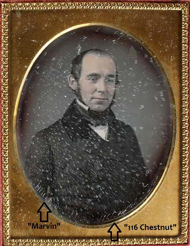 The Library Company of Philadelphia produced a fascinating exhibit in 2009 called, Catching a Shadow: Daguerreotypes in Philadelphia, 1839-1860 (click to see the online version), which had the following to say about P.B. Marvin, "Marvin had a Chestnut Street studio for five years during the 1850s, but little is known about his career. The pride he took in his work, however, is evident in his unusual decision to etch his name and address into the daguerreotype plate."
