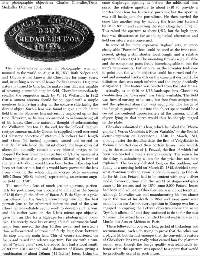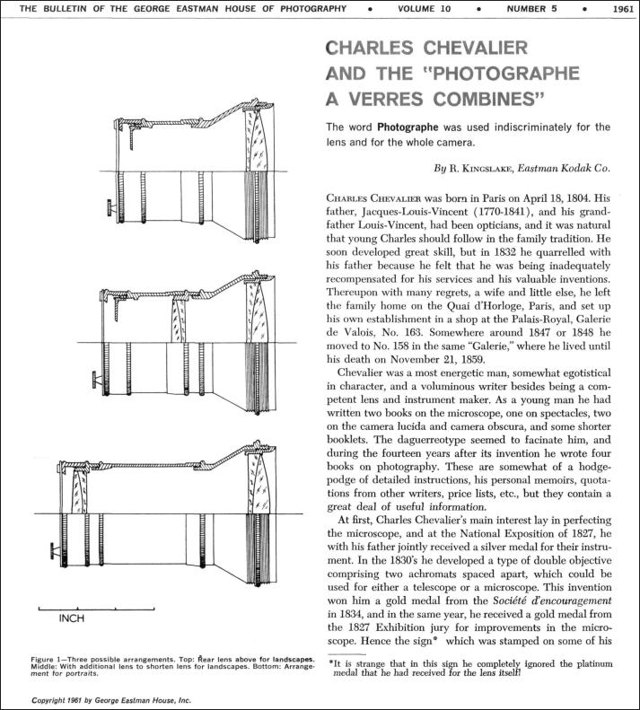 In 1961, Rudolph Kingslake published an article in Kodak's IMAGE bulletin regarding Chevalier:
