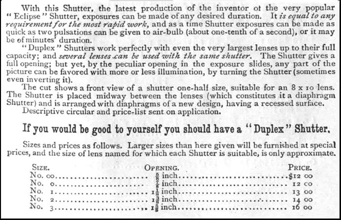 1885 Advertisement for the Eclipse and Duplex shutters: