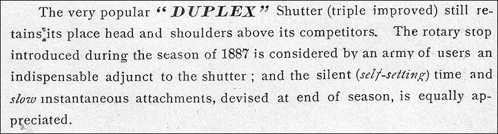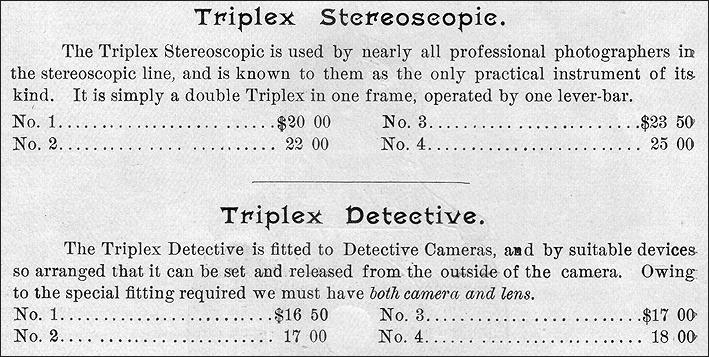 Also brought to market in 1889, were the Duplex and Triplex Stereoscopic shutters and Duplex and Triplex Detective shutters.