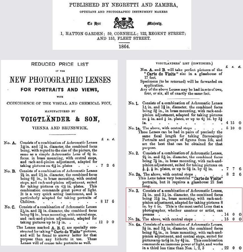 In an 1864 catalogue, the lens is listed as the # 3 a, with the "a" meaning it came with waterhouse stops.